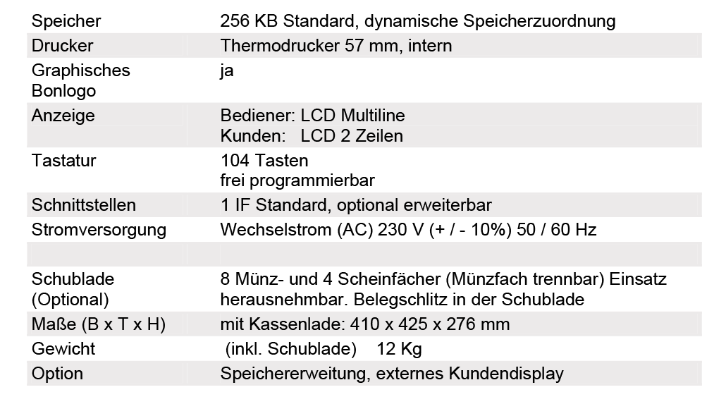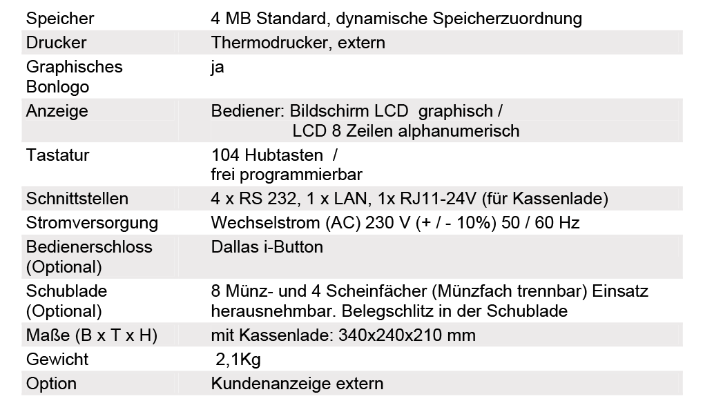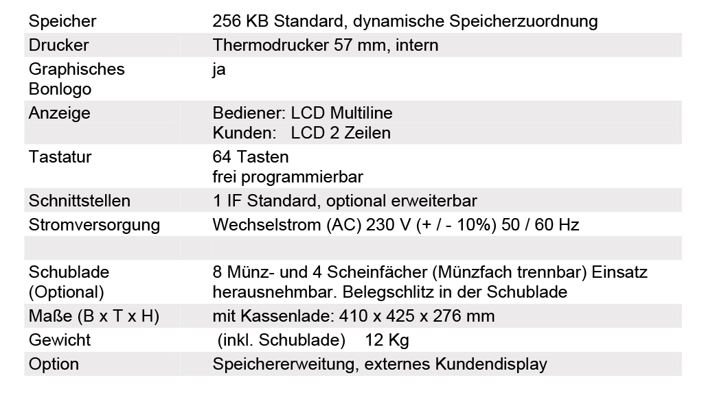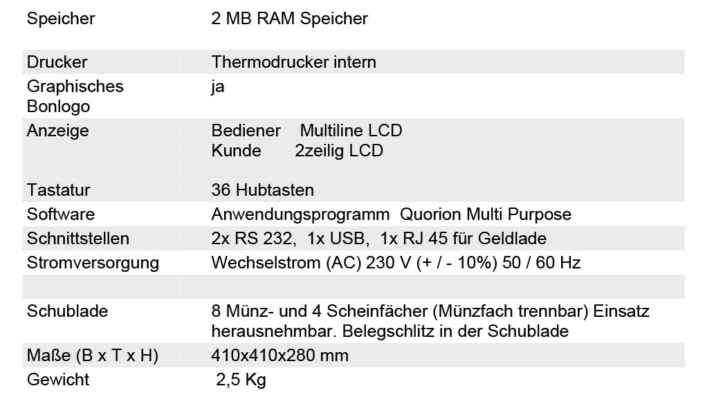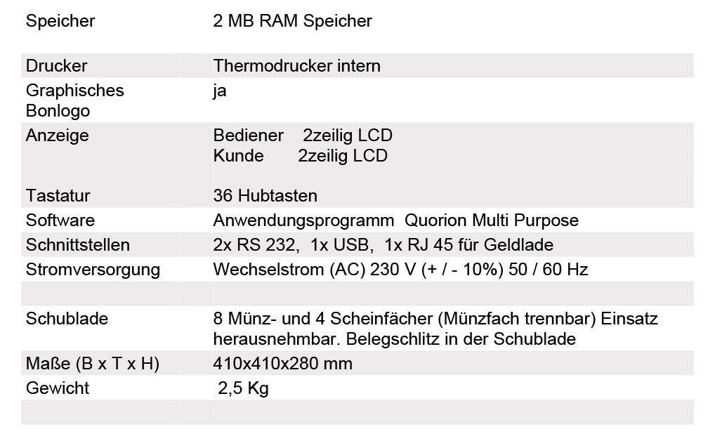 Kompakte Größe, Artikel und Warengruppen, eine leicht zu überschauende Tastatur sowie einfache Bedienung und ein umfangreiches Berichtswesen – das sind die Hauptanforderungen, die Geschäftsinhaber an ihre Kasse stellen. Die QMP 50 erfüllt alle diese Forderungen. Weiterhin ist sie mit einem mehrzeiligen Bedienerdisplay ausgestattet, welches einen komfortablen Überblick über die laufende Buchung ermöglicht. Die QMP 50 ist mit einem kinderleicht zu bedienenden Easy-Load Drucker ausgestattet. Sie besitzt zwei graphische LCD-Anzeigen, zwei serielle Schnittstellen, einen USB-Port sowie einen Kassenladenanschluss.